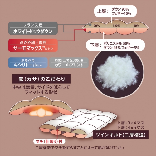 上層部には羽毛を、下層には粒状にした遠赤ワタと羽毛をミックスして充填
